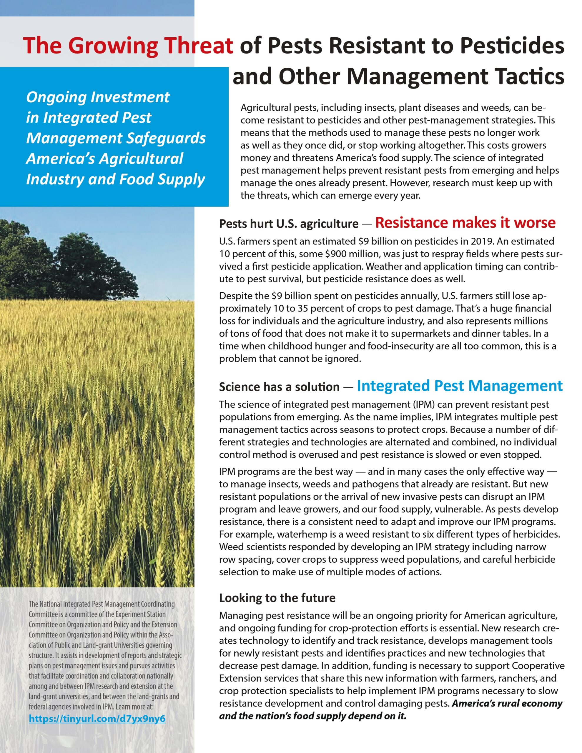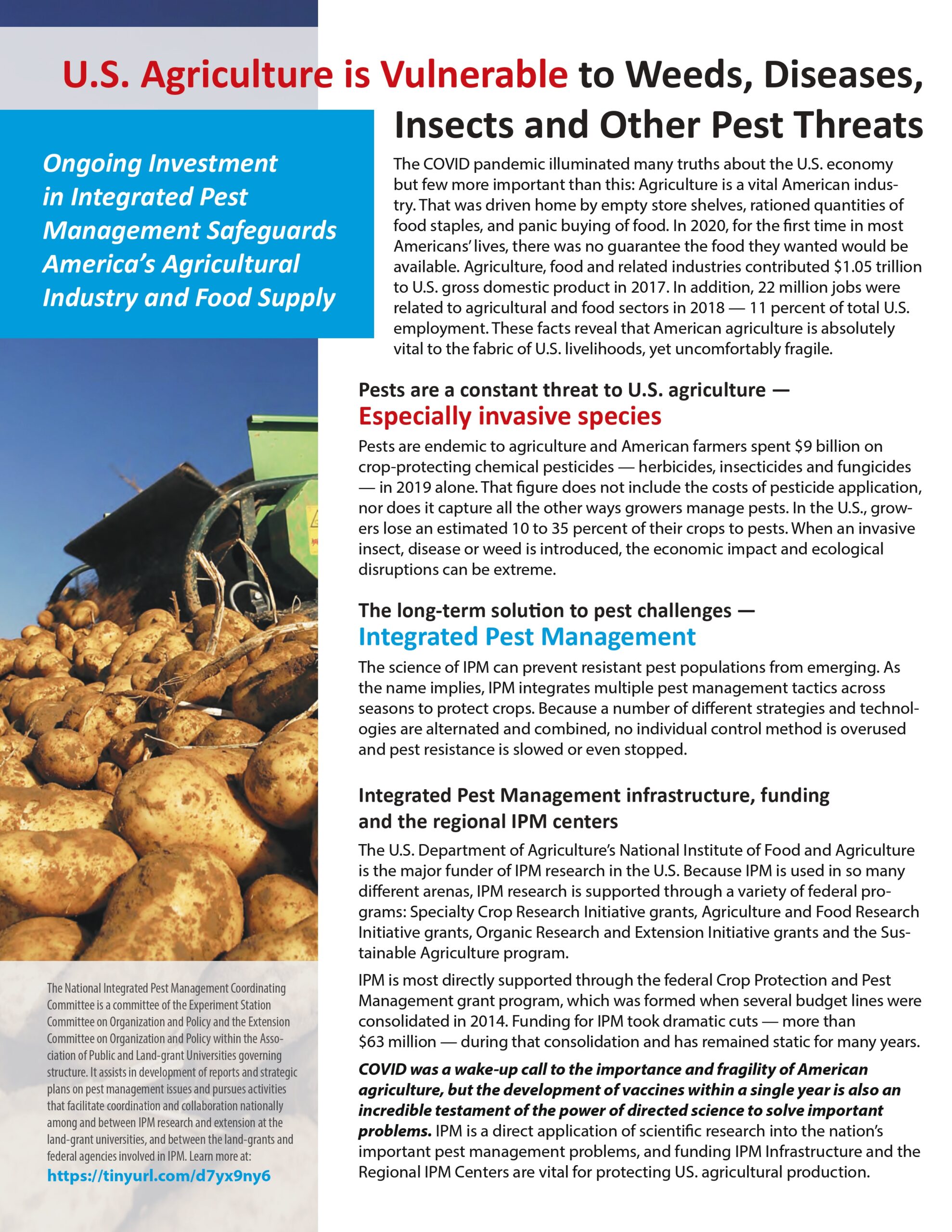 Agriculture is the essential American industry, contributing $1.05 annually to the U.S. economy, creating one in 10 American jobs, and providing American families a dependable supply of affordable, wholesome food. Integrated Pest Management creates sustainable long-term solutions to manage the pests that threaten our crops – combining biological, cultural, physical and chemical tools to control pests in efficient, economical and environmentally responsible ways. |