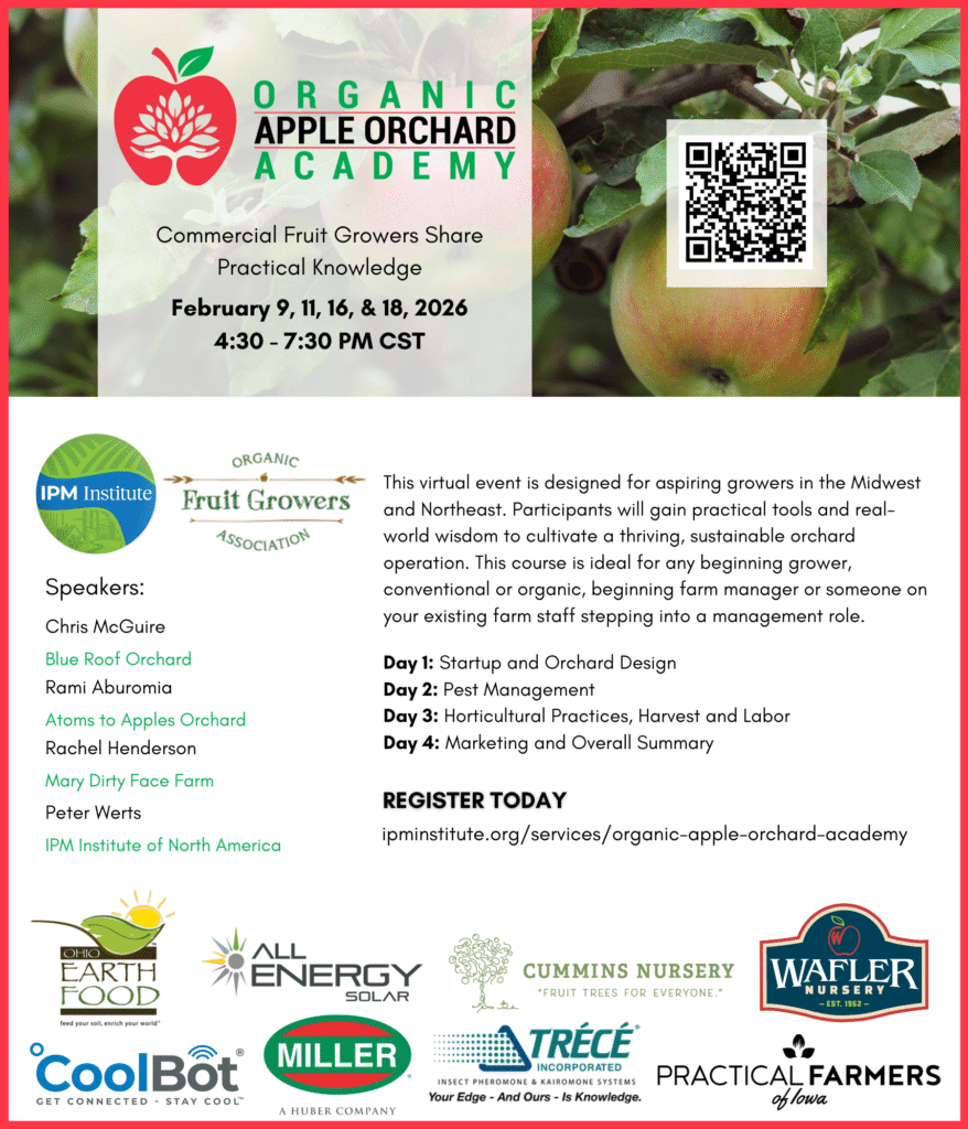 The Organic Apple Orchard Academy is a premier virtual event hosted by the IPM Institute of North America and the Organic Fruit Growers Association. This course will benefit anyone interested in learning more about managing a small orchard and will include content on site selection/site prep, orchard design and layout, varieties and rootstock, horticultural practices, marketing and organic approaches to pest management.